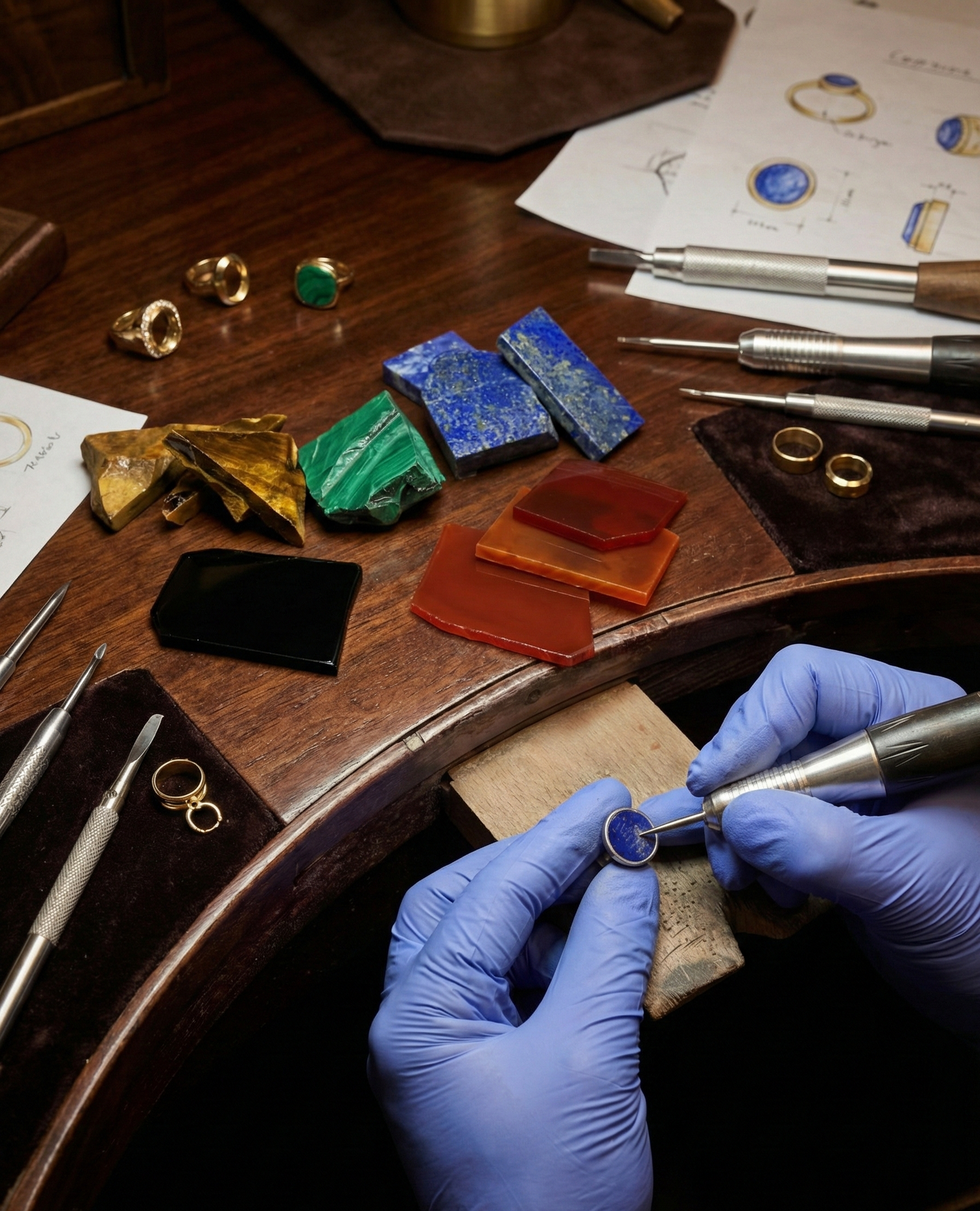 In our atelier, we create unique, handcrafted hardstone signets, designed to reflect the true essence of those who wear them.